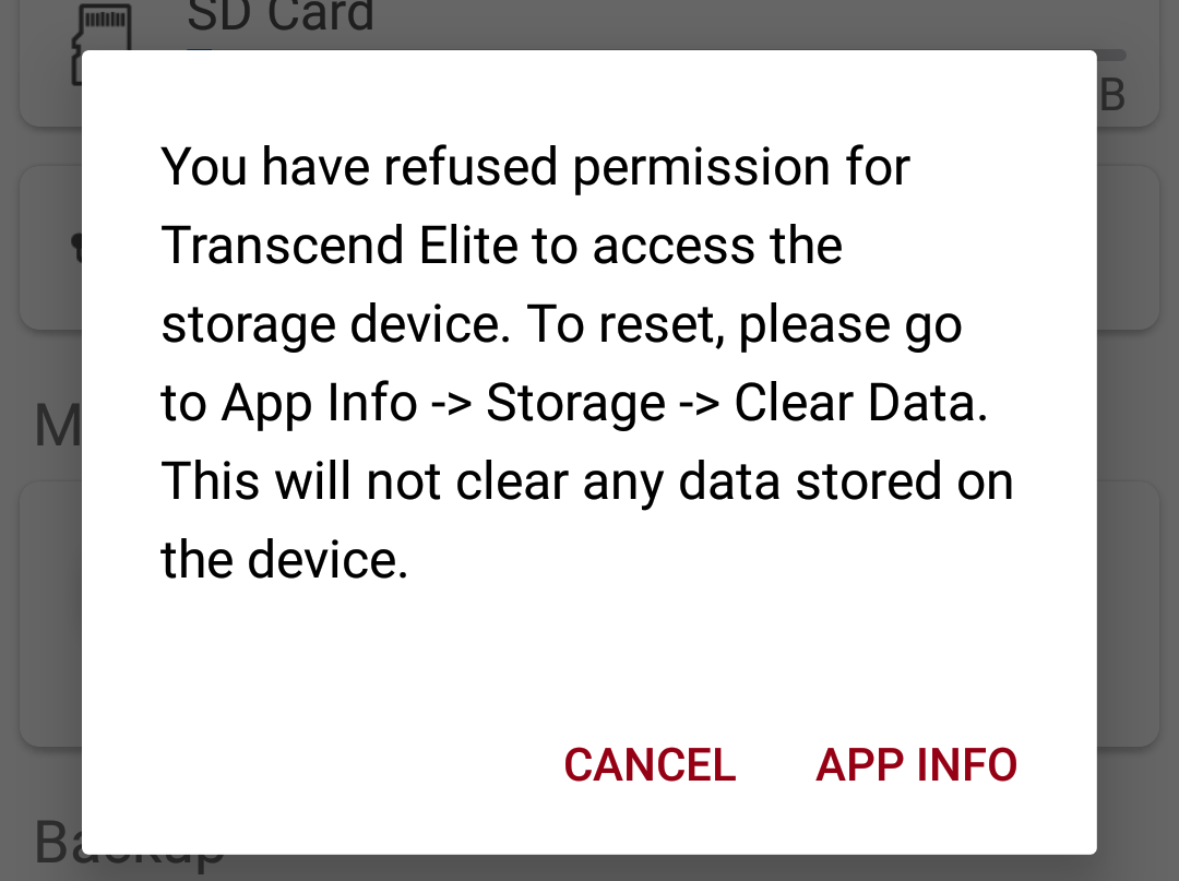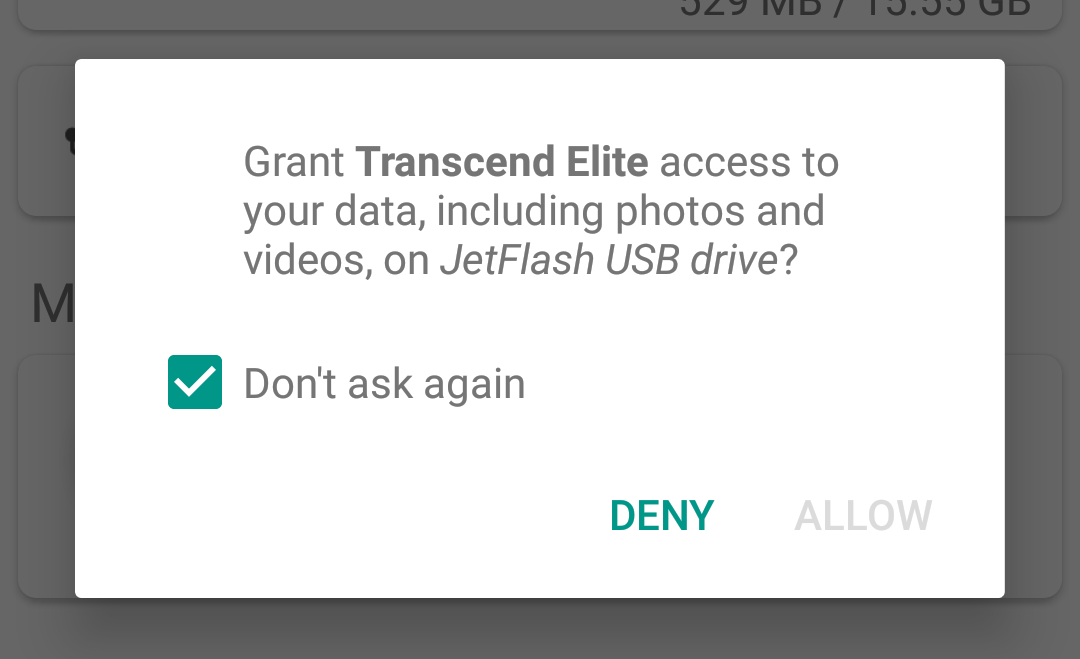 如果你点击拒绝两次,然后选择不要再问,Transcend Elite应用程序将不会再次请求许可,除非你清除所有设置。